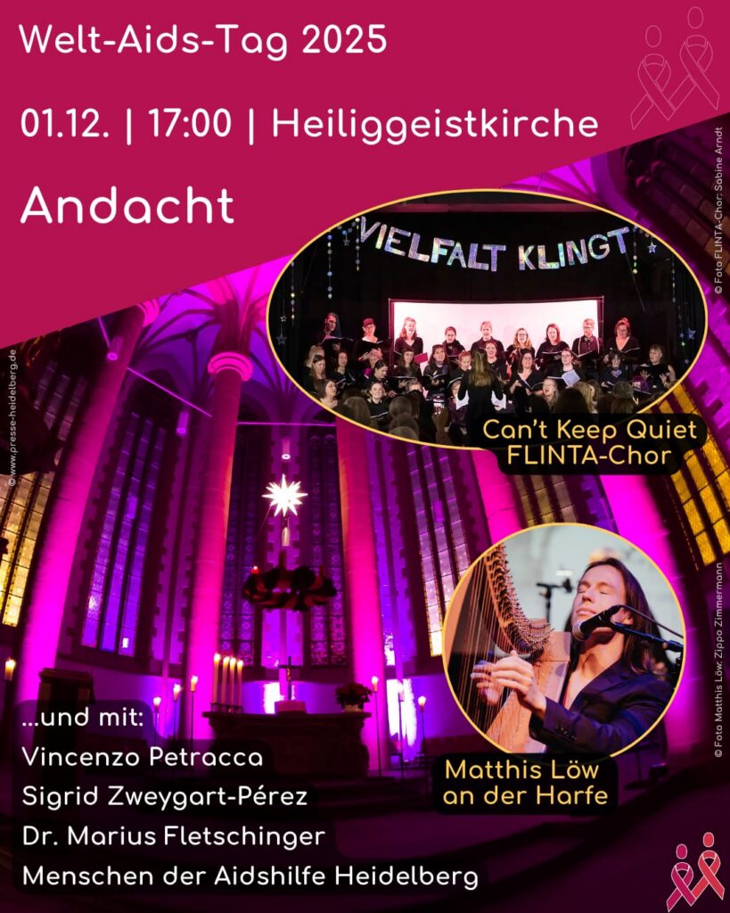 Vincenzo Petracca, Sigrid Zweygart-Pérez und Dr. Marius Fletschinger führen durch die Andacht. Menschen aus der Aidshilfe Heidelberg bringen aktuelle Infos und eigene Geschichten mit. Die Kollekte geht an diesem Abend an die Aidshilfe Heidelberg.